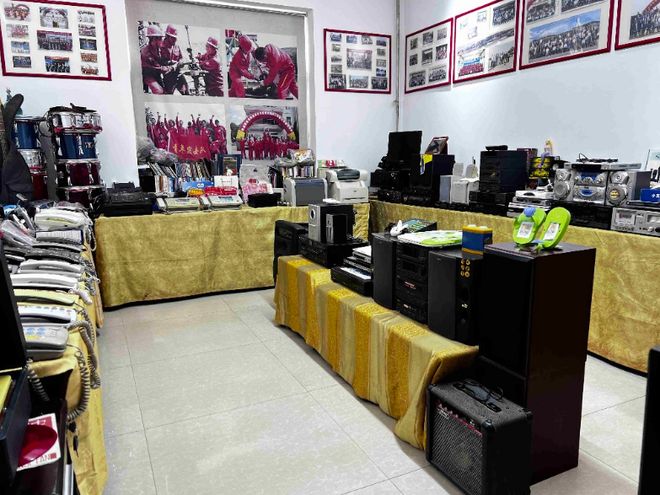 一次,喜欢收藏的颜淑勇将自己原来工作生活时用的老物件拿到排练室让大家参观,没想到激起了他们的回忆,不少团员也纷纷拿出以前物探作业用的检波器、洛阳铲,钻井用的榔头、边铲;采油用的管钳、扳手,生活用的淋浴器、锅碗瓢盆等老物件以及工作证、书籍,慢慢地东西越聚越多,更衣室都放满了。